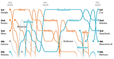 Yenilik Yarışı… Viral bir grafik, Çin’in açık ağırlıktaki yapay zeka modellerinin küresel çapta nasıl hızla yayıldığını ve Batı’nın kapalı modellerine nasıl meydan okuduğunu gösteriyor.